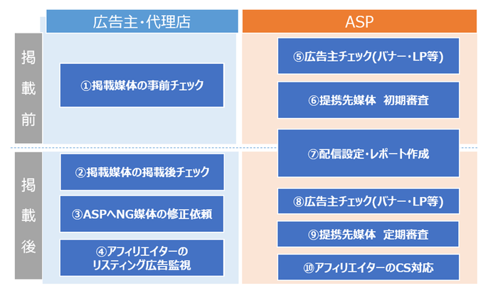 本サービスでは、アフィリエイト広告の掲載前・掲載後のチェックや監視から、掲載前後で発生する定型業務、その後のASP事業者への修正依頼やアフィリエイターへのCS対応までを一括で代行いたします。