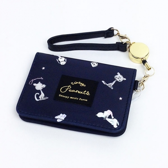 2つ目は、こちらの夜を思わせるネイビーがクールな印象を思わせるパスケースです。スヌーピーとファーロンがプリントされていますね。