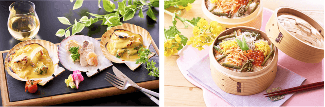 左:帆立や鯛にフキノトウを混ぜた特製の味噌を添えて焼き上げた「海鮮味噌焼き フキノトウの香り」。火入れすることで旨味が膨らむ海鮮と、ほろ苦さの後に清涼感を感じるフキノトウ入りの味噌のコラボレーションには、新潟の淡麗な地酒を合わせてお楽しみください。