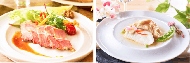 右:春の真鯛と押し麩 桜蒸し。旬を迎え始めた白身魚の王様・鯛と、もちもちとした食感の岩船の押し麩を上品な出汁で蒸しあげた一品。桜の塩漬けの塩気、香りが目にも舌にも春を告げる一品です。