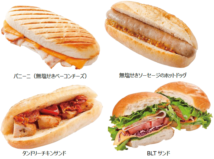 ホットサンドやサンドイッチは国産小麦を使用。具材にもこだわり、無塩せきベーコンやソーセージ、有機あんこなどをサンドした商品を多数取りそろえます。