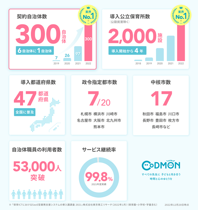 保育・教育施設向けICTサービス「CoDMON(コドモン)」を提供する株式会社コドモン(本社:東京都港区、代表取締役:小池義則)は、12月14日(水)に全国の公立保育所等2,005施設に導入済みとなり、約24%(※1)がコドモンを導入済みとなったことをお知らせします。