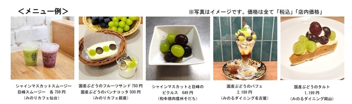 今回のフェアでは、皮ごと食べられて甘みが強く、上品な味と香りで大人気の「シャインマスカット」や、ぶどうの王様「巨峰」、大粒であふれる果汁が魅力の「ピオーネ」などを食べ比べできるメニューを各店舗で提供します。