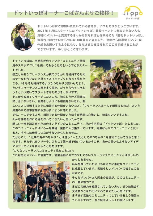 【フリーランスコミュニティ】コミュニティ内の週刊報告『週刊ドットいっぽ』が第100号を突破! | NEWSCAST