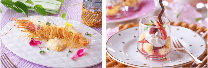 左:有頭海老をカダイフ麺で巻いて揚げた一品。別名「天使の髪」とも呼ばれる細さのカダイフ麺の軽やかな食感とパリッと揚がった海老の香ばしさをご賞味ください。