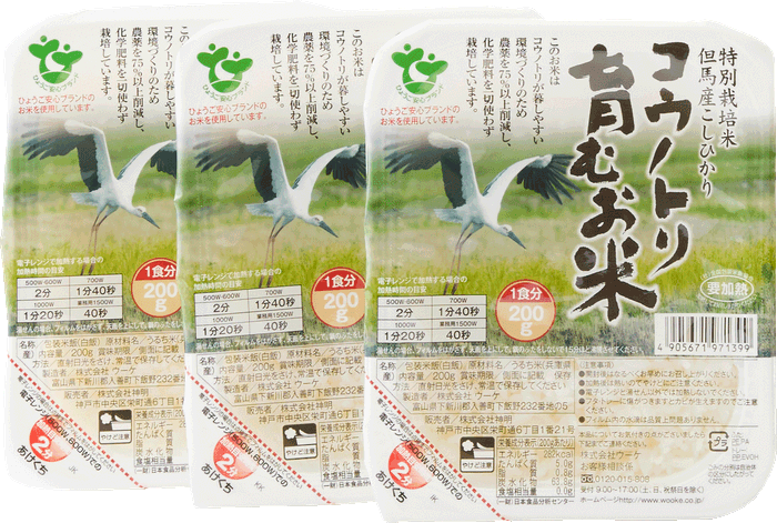 兵庫県但馬産の特別栽培米コシヒカリ「コウノトリ育むお米」のパックごはん。「コウノトリ育むお米」は、カエルやドジョウなど、コウノトリのエサとなる生き物が育つ環境づくりに取り組み、コウノトリの野生復帰を支える「コウノトリ育む農法」で栽培・収穫されています。できる限り自然のままを追求した安全・安心の田んぼで、生産者が愛情を注いだ人と自然に優しいお米です。電子レンジで約2分。お手軽にお召し上がりいただけます。