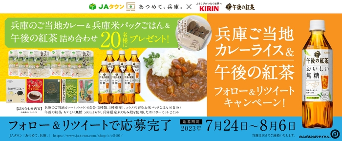 JAタウン「あつめて、兵庫。」の公式Twitterアカウントをフォローし、キャンペーン対象ツイートをリツイートした方の中から、抽選で20名様に「兵庫県内JAのオリジナルレトルトカレー」・「兵庫米パックごはん」・「キリン 午後の紅茶 おいしい無糖」そして「兵庫県産米のもみ殻を使用したカトラリー」のセットをプレゼントいたします。
