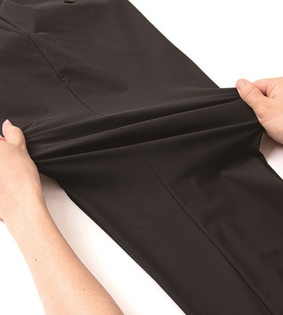 今回発売する『ゼロプレッシャースーツ』には、水着などのスポーツウェアにも使用される機能性ファブリックを採用しました。この生地は、旭化成株式会社のストレッチ繊維「ROICA®(ロイカ)」を使用したニット生地で、縦・横の両方向への高い伸縮性が特徴。一般的なスーツと比べて縦・横ともに6倍(当社比)のストレッチ性を誇るなど、抜群の動作性を体感できます。また、着用時の圧迫感(着圧)が極めて少ない他、今回のスーツは裏地・芯地・肩パッドなどの付属を可能な限り省くことで、これまでにない“解放的”な着用感を実現しています。