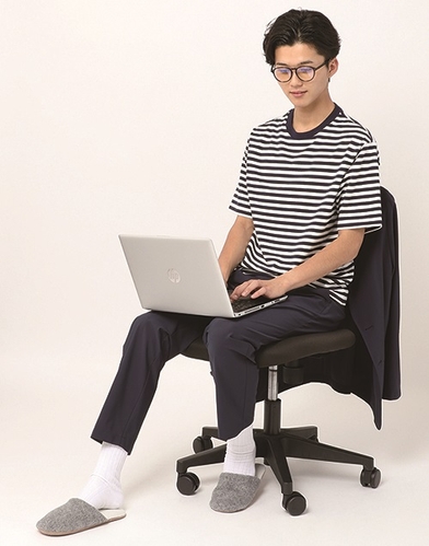 生地は上品でなめらかな表面感に仕上げており、タイドアップしたビジネススタイルから、カットソーや スニーカーなどを合わせるカジュアルスタイルまで様々なスタイルと相性が良く、幅広いコーディネートを お楽しみいただけます。軽やかでリラックス感のある着心地のためテレワーク服としてもおすすめです。
