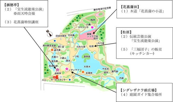 期間中には伝統芸能公演や花菖蒲に関する特別講座も実施します。古典文学や和歌にもしばしば登場し、その優雅な佇まいで季節の移ろいとともに心に静かな感動を与えるハナショウブ。涼やかに彩られた初夏の庭園をお楽しみください。