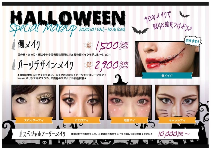 今年のハロウィンはどのように過ごされますか?アトリエはるかでは、みなさまに安心してハロウィンを楽しんでいただけるようにと、初めて【harukaオリジナルマスク】をご用意しました!目元を中心にメイクを施す『パーツデザインメイク』や『傷メイク』と組み合わせれば、一人一人違ったハロウィンメイクが完成。『フルデザインメイク』と組み合わせれば、マスクを付けた時と外した時で違った表情になり、さらにクオリティの高いハロウィンメイクをお楽しみいただけます。自粛ムードが続きますが、対策を万全にして今年も素敵なハロウィンをお過ごしください!