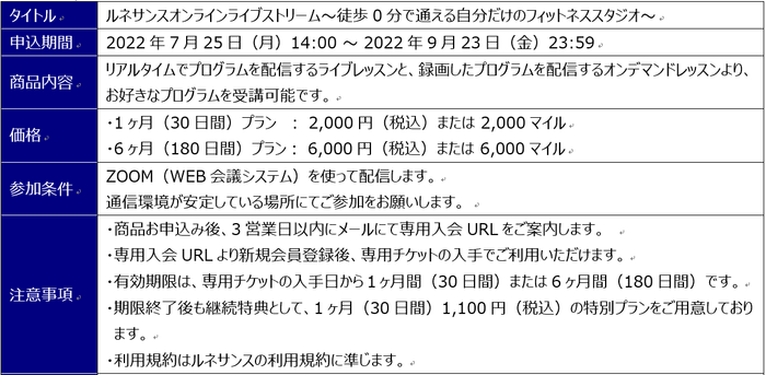 この度、ANA Xが目指す「毎日の暮らしをより健やかに、活動的にするお手伝いする」という方向性と、ルネサンスが提供する時間や場所を気にせず運動習慣を身につけることができるオンラインフィットネスサービス「オンラインライブストリーム」が一致したことから、日常生活をより豊かにするための健康維持・増進のサポートを目的として、本商品を企画しました。