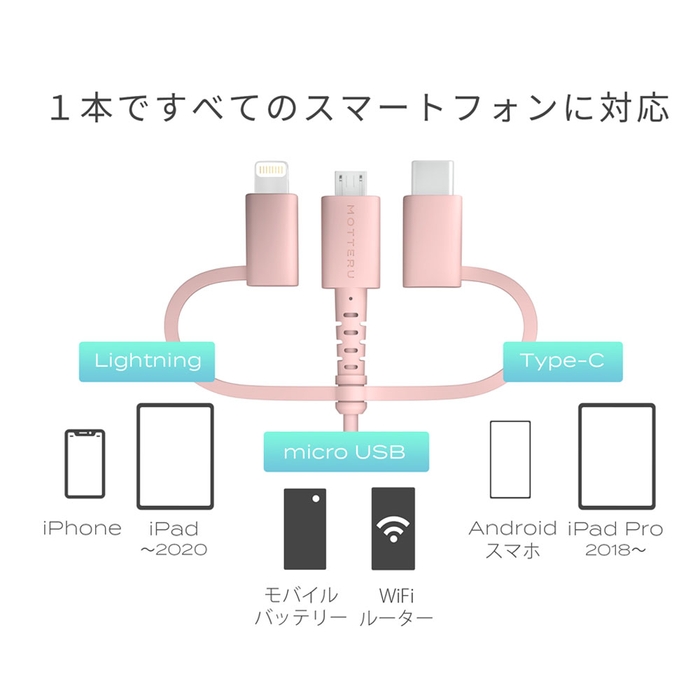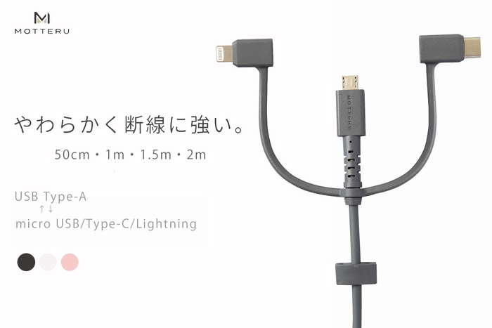 MOTTERU(持ってる)と安心!1本でmicroUSB/Lightning/Type-Cに対応する柔らかくて断線に強い3in1ケーブル