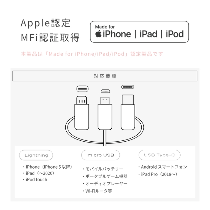 対応機種:iPhone 5以降のiPhoneまたはLightningを搭載したiPadやiPod touch スマートフォン , タブレットPC , モバイルバッテリー , ポータブルゲーム機 , オーディオプレーヤー , Wi-Fiルータ , 等microUSB / USB Type-C対応機種