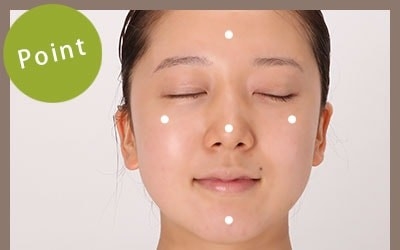 いきなりそのまま顔につけるとムラになりやすいので最初に顔の5点(右頬、左頬、額、鼻、アゴ)に乗せていきましょう。
