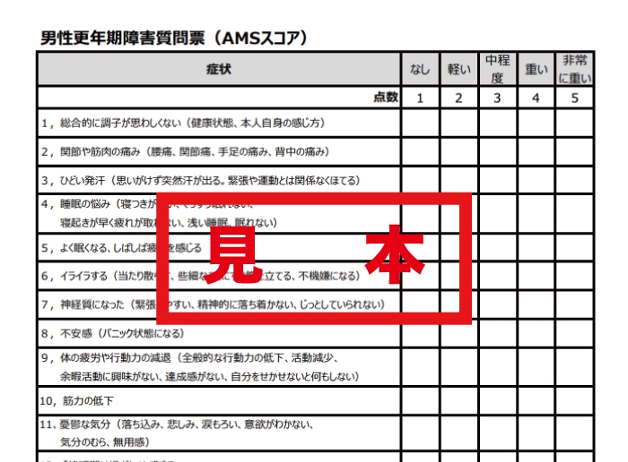 男性の場合、「男性更年期障害質問票(AMSスコア:Aging Males’ Symptomsスコア)」で更年期の症状の程度を判断します。こちらも男性更年期でよくみられる症状が判断項目として設けられています。 SMIと同様、各項目ごとに当てはまる症状の程度をチェックし、各設問に点数を合計して下さい。