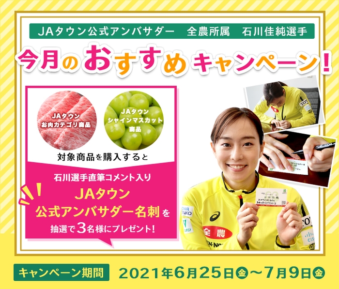 JA全農が運営する国産農畜産物産地直送通販サイト『JAタウン』では、全農所属 卓球日本代表の石川佳純選手が公式アンバサダーに就任し、毎月石川選手自ら『JAタウン』の商品を注文し、石川選手が実際に食べて楽しみながらその魅力を発信しています。