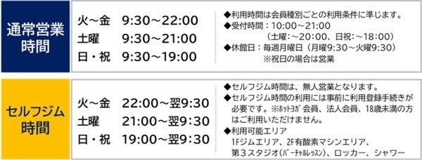 通常営業時間内でのご利用に加え、通常営業終了から翌朝開館するまでの時間に、ジムエリアのセルフ利用ができるようになります。また、新たにセルフジム時間のみ利用できる会員種別を設置します。