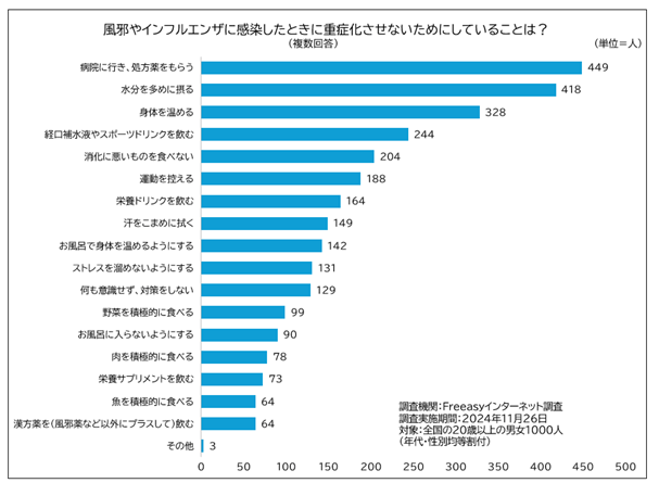 2024年11月に大正製薬株式会社が、全国の20代以上の男女1000名を対象に「風邪やインフルエンザに感染したときに重症化させないためにしていること」を聞いたところ、多い順に「病院に行き、処方薬をもらう」(449人)、「水分を多めに摂る」(418人)、「身体を温める」(328人)、「経口補水液やスポーツドリンクを飲む」(244人)、「消化に悪いものを食べない」(204人)、「運動を控える」(188人)、「栄養ドリンクを飲む」(164人)という回答でした。