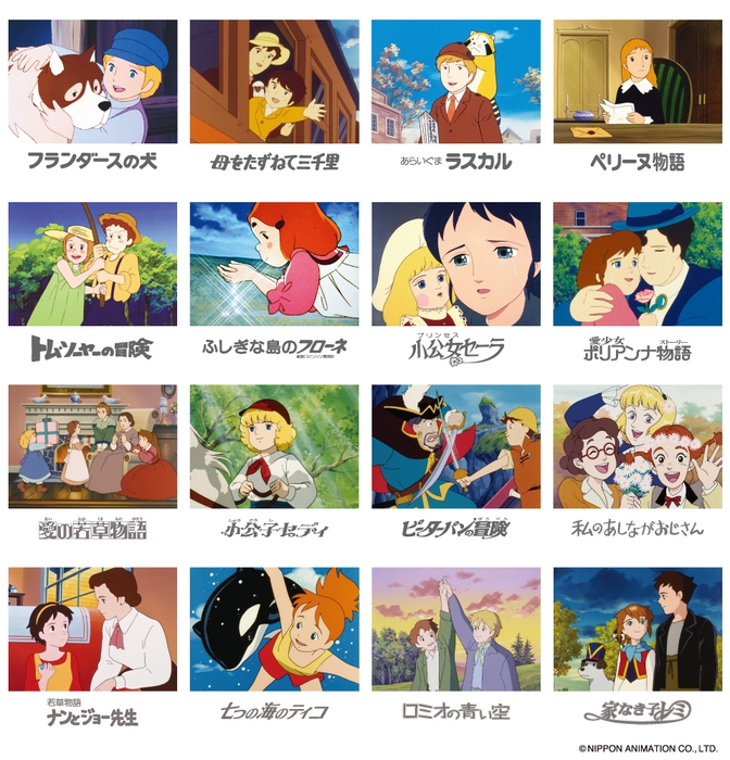 対象作品:「フランダースの犬」、「母をたずねて三千里」、「あらいぐまラスカル」、「ペリーヌ物語」「トム・ソーヤーの冒険」、「ふしぎな島のフローネ」、「小公女セーラ」、「愛少女ポリアンナ物語」、「愛の若草物語」、「小公子セディ」、「ピーターパンの冒険」、「私のあしながおじさん」、「若草物語 ナンとジョー先生」、「七つの海のティコ」、「ロミオの青い空」、「家なき子レミ」