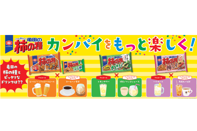 キャンペーンサイト内では、「亀田の柿の種 みんなでカンパイ!」というキャンペーン名称にちなんで、それぞれの「亀田の柿の種」にぴったりなドリンクを紹介しています。