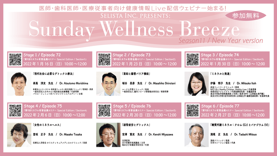 『SELISTA Inc. Presents; Sunday Wellness Breeze』は日頃、抗加齢医療・予防医療・栄養療法に携わられている先生方を対象に、爽やかな微風が心地よいゆったりとした日曜日の朝、ブランチでも食べながら新しい予防医療に関する情報を気軽な気持ちでご視聴いただける医療のプロ向け無料健康情報Live配信ウェビナーです。毎回各分野の第一人者を講師にお招きし、最新の医療情報を提供いたします。