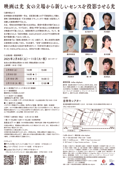 劇団印象-indian elephant- 第32回公演『女性映画監督第一号』が2025年2月8日 (土) 〜 2025年2月11日 (火・祝)に吉祥寺シアター(東京都武蔵野市吉祥寺本町1-33-22)にて上演されます。