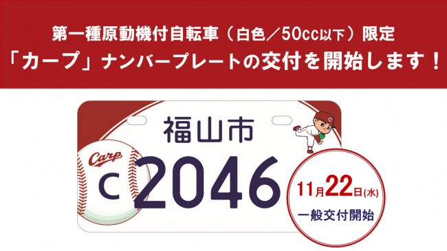 広島県福山市では、第一種原動機付自転車(白色/50cc以下)のナンバープレートについて、2023年(令和5年)11月22日(水曜日)より「カープ」ナンバープレートの交付を開始します。