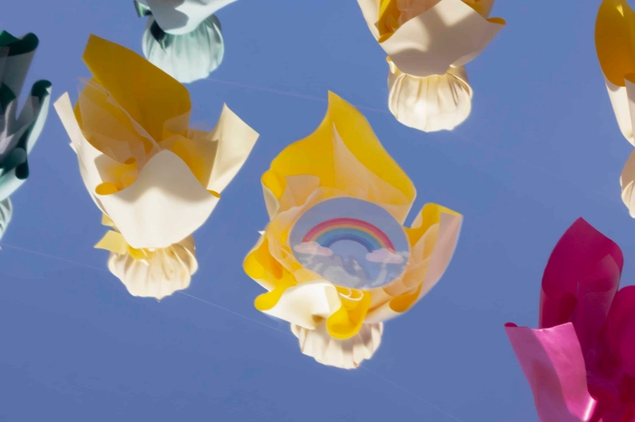 ピーマン通りに並ぶ「ふれふれ坊主」1,500個のうち、8個の「ふれふれ坊主」の下に虹や傘など、雨にまつわるモチーフが隠れています。下から「ふれふれ坊主」を映し出すリフレクションを使って、8個のモチーフを見つけ出し、写真を撮るとフォトミッションクリアです。クリアすると、雨にちなんで「ふれふれ坊主」の絵が描かれた「あめ」がもらえます。雨の日には特別なレインボーカラーの「あめ」を用意しています。雨の日も楽しい気分になれるアクティビティです。