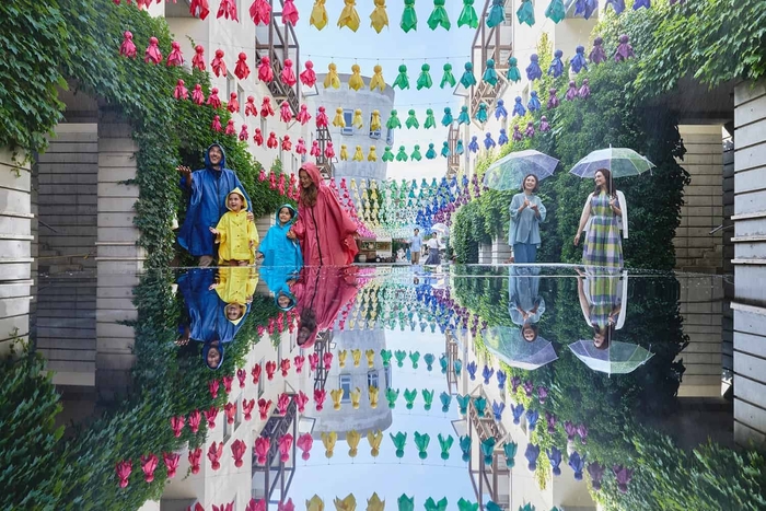 全長150mのピーマン通りに、雨を待ちわびる1,500個の「ふれふれ坊主」が並び、雨に濡れるとより鮮やかに色づきます。さらに今年は、上部に並ぶ「ふれふれ坊主」を映すリフレクションが新たに登場。カラフルで明るい気持ちになれる景色が上にも下にも広がります。また、リフレクションを使って、まるで「ふれふれ坊主」に囲まれているかのような写真撮影も楽しめます。雨の日にはカラフルなポンチョを貸し出しているので、「ふれふれ坊主」と同じ色のポンチョを着て、鮮やかでカラフルな景色の中を散策するのもおすすめです。