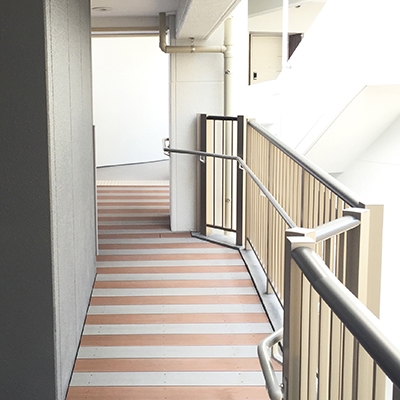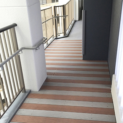 【納入事例レポート】あ、ここにも杉田エース!Vol.183 福岡市天神北に新築された最上級クラスの分譲マンションの通路スロープ用として再生木材エス・ウッドが採用されました。2色のエス・ウッドデッキを組み合わせることにより、とてもおしゃれな通路に仕上がりました。