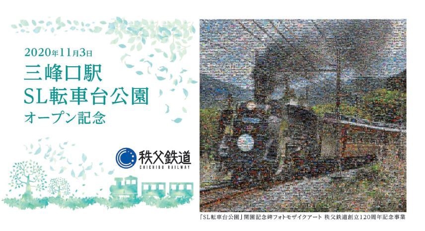 SL転車台公園は、老朽化により解体撤去した鉄道車両公園の跡地を利用し、当社創立120周年記念事業として2019年より整備を進め、この度、正式オープンとなります。公園のテーマは「地域の自然と鉄道の調和」であり、SL転車台を中心に樹木、芝生、遊歩道を配置する設計としています。公園開園記念として、フォトモザイクアート記念碑を制作、建立いたしました。フォトモザイクアートはお客様から募集した思い出の写真などを基に、SLパレオエクスプレスを表現しております。