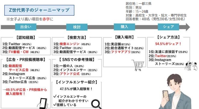 SHIBUYA109 lab.は、Z世代400名(男性200名/女性200名)を対象とした、消費行動の意識調査を行った。その結果を見ると、Z世代と言っても、男女の間で商品の出会いから購入、シェアまで違いがあることがわかる。