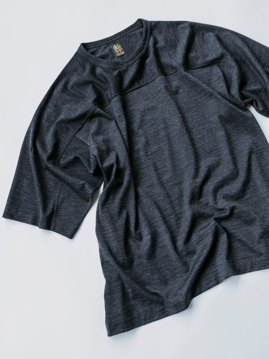 この生地を使って、古着のフットボールTシャツの形をベースに別注しました。古着には存在しないウール100%のフットボールTシャツは、身幅もボックスシルエットに仕上げる事で軽やかに着用する事が可能になりました。
