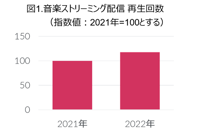 音楽ストリーミング配信市場は、伸長率が下がっているものの2022年の再生回数は前年の18%伸長となり、ストリーミング利用は堅調に増加傾向となった(図1)。