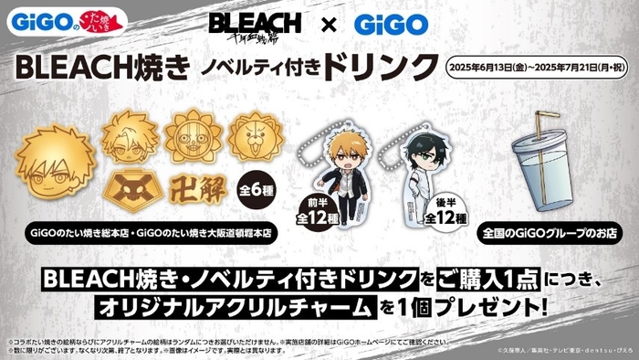 ・GiGOのたい焼き総本店とGiGOのたい焼き大阪道頓堀本店でオリジナルアクリルチャームがランダムで1個付いてくるコラボたい焼き「BLEACH焼き」の販売を行います。