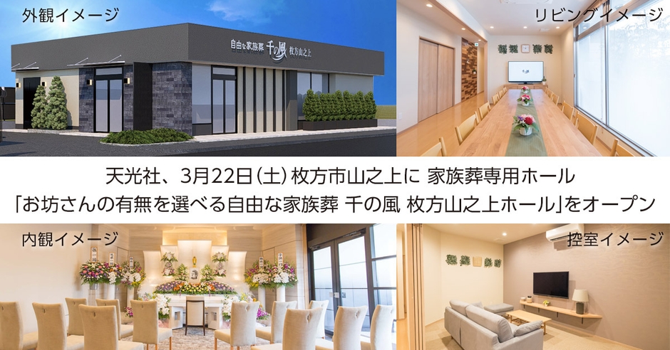 この度、大阪府枚方市で2店舗目(グループ累計61ホール目)となる、1日1組貸切の家族葬専用ホール「お坊さんの有無を選べる自由な家族葬 千の風 枚方山之上ホール」(以下 枚方山之上ホール)をオープンいたします。