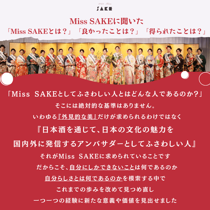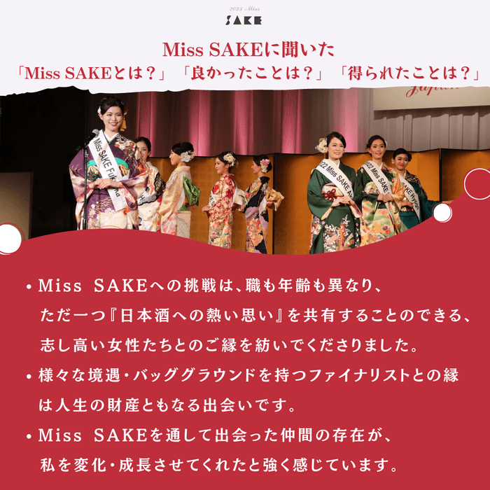 また、Miss SAKEに「Miss SAKEとは?」「良かったことは?」「得られたことは?」聞いた答えをお伝えいたします。