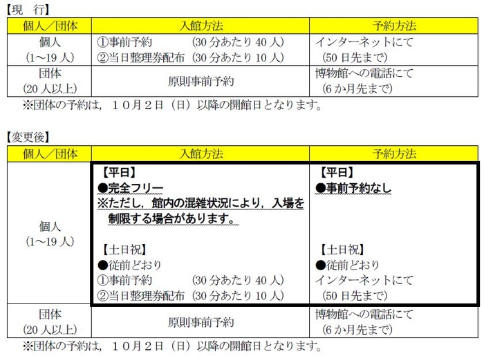 ※既に10月4日(火)以降の平日に事前予約をされている方につきましては,既存の予約通りにご来館ください。