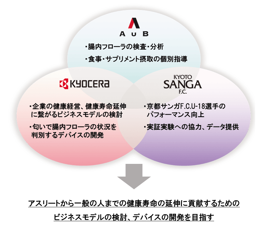 このたびの共同研究で3社は、AuBが蓄積したトップアスリートの検体から導き出した腸内フローラの状態との解明データを活用し、京都サンガF.C.U-18に所属する選手29人のパフォーマンス向上に繋げるとともに、匂いで腸内フローラの種別や活性度を計測するデバイスの開発や企業の健康経営の促進、また一般の人の健康寿命の延伸に貢献するビジネスモデルの検討を進めてまいります。