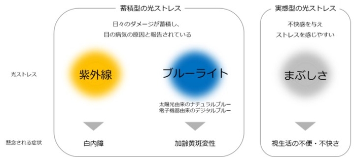 ブルーライトは私たちがよく知っているデジタル機器由来の「デジタルブルーライト」だけではなく、太陽光からの「ナチュラルブルーライト」もあります。「ナチュラルブルーライト」はデジタル機器の100倍から500倍のエネルギーを持つとの研究報告もあるので、日中のブルーライトの浴びすぎにも注意が必要です。ブルーライトは紫外線より目の奥まで届き、網膜への影響が報告されています。そして、加齢によって光をまぶしく感じやすくなる傾向があります。高齢の方は、まぶしさ対策を行うことでより快適に視生活を過ごすことができると考えられます。このように、「紫外線、ブルーライト、まぶしさ」は日常の中で私たちにストレスを与える、「光ストレス」と考えています。