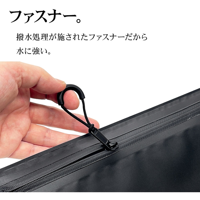 縫い目がないシームレス加工と撥水処理が行われたファスナーで水が浸み込みにくい設計。