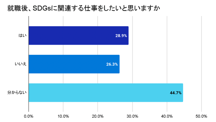 就職後、SDGsに関わる仕事がしたいかという問いに対して、約45%の学生が「分からない」と回答しました。上記のSDGsの理解度に関する調査で、学生の回答においては「理解している」が最多の55.6%でしたが「理解しており人に説明できる」といった回答は29.7%であったため、まだ実際の仕事の業務においてSDGsがどう関わってくるのかまで深くSDGsを理解できていない学生が多いと推測できます。