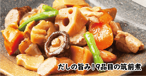 「だし」・「かえし」・丁寧な調理、妥協を許さずすべてにこだわり、お客様が「ご飯に合う!」・「また食べたくなる!」と喜んでくださる笑顔を想像して開発しました。細部にまでこだわり抜いて開発した「だしの旨み!9品目の筑前煮」をぜひご賞味くださいませ。