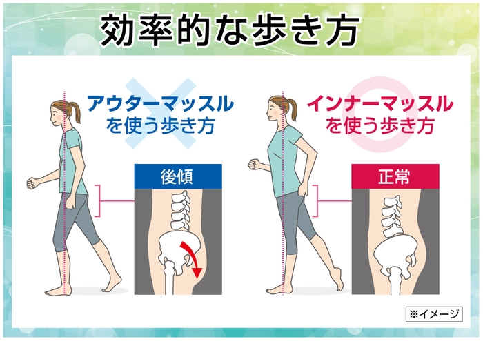 具体的には、骨盤が後傾した姿勢だと「インナーマッスル」がうまく使われず効率の悪い歩き方になってしまいますが、骨盤を正常な傾きにキープすることでインナーマッスルが使われ、効率の良い歩き方ができるようになります。