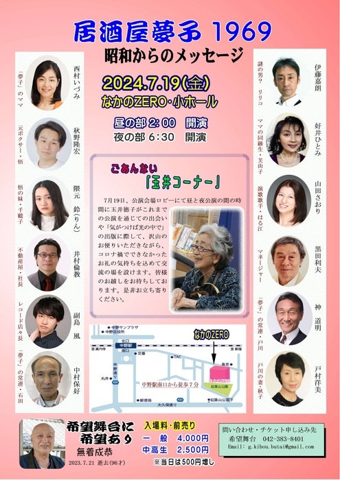 劇団希望舞台(代表:由井 数)主催、『居酒屋夢子・1969』が2024年7月19日 (金)になかのZERO(東京都 中野区 中野 2丁目9番7号)にて上演されます。