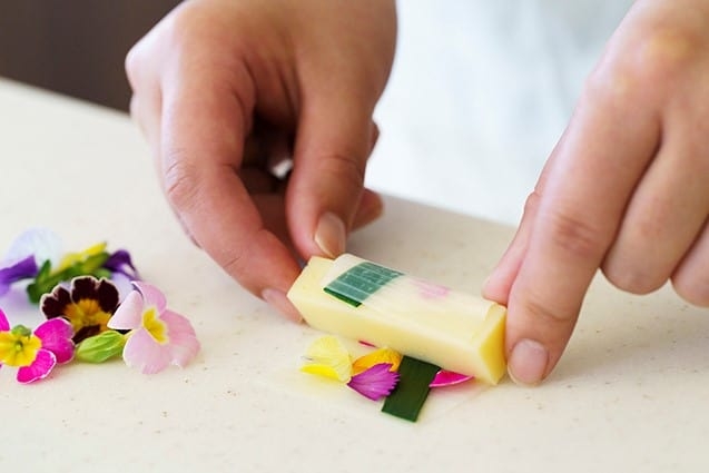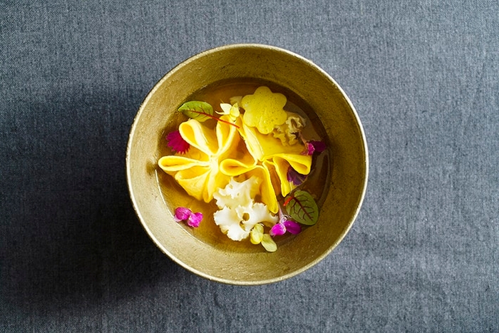 料理体験でつくる伝統の宮廷料理と共に、琉球料理伝承人による指導を受けた星のや沖縄のシェフが作るオリジナル料理を味わいます。沖縄特有の文化や食材を料理に取り入れ、沖縄で新しい食の魅力を日々発信するシェフがつくる料理は、伝統の宮廷料理「花しんすうの吸物」からインスピレーションを受けた「花しんすうのコンソメスープ」です。本来は、カツオ出汁で味わう吸い物を黄金色に輝くコンソメスープで仕立てます。花を表現した薄焼きの玉子や秋に橙色の花を咲かせる「クワンソウ」も浮かべる、香りも見た目も華やかなスープです。シェフの料理もプライベートキッチンで仕上げるため、調理をする様子を目の前で見学でき、沖縄特有の食材について特徴やおすすめの調理法などを聞くことができます。