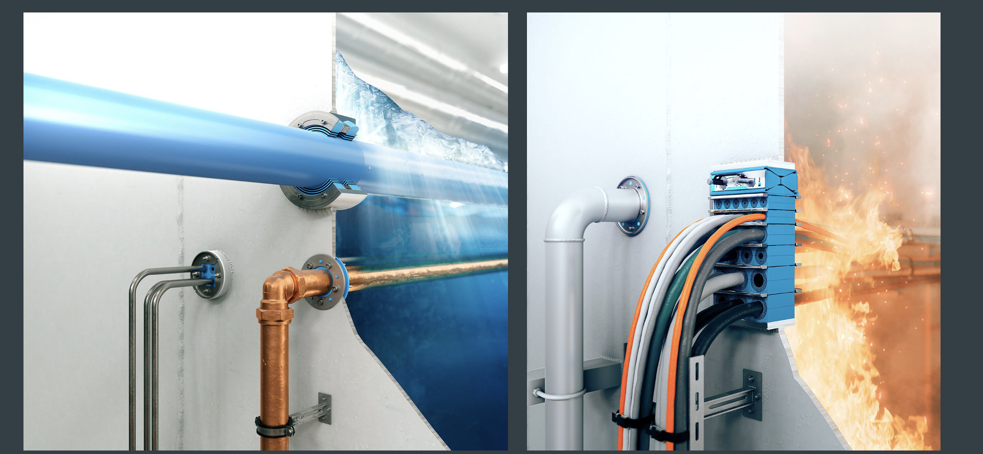 火気作業不可のエリアや修繕作業に理想的な、溶接不要な貫通部ソリューション。ドリル孔に挿入するだけで確実な密閉を確保可能です。耐火、水密性能があります。