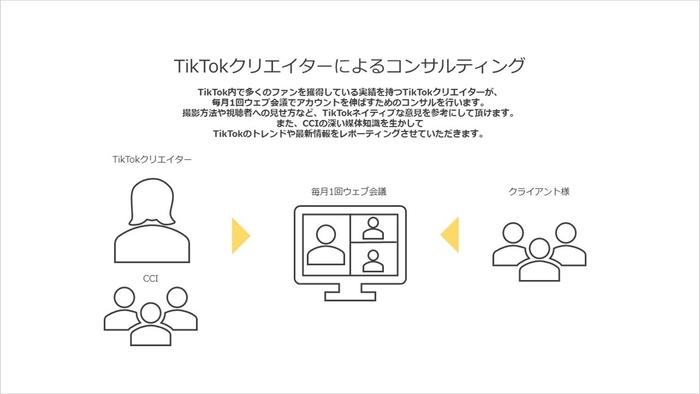 ・TikTok内で多くのファンを獲得している実績を持つTikTokクリエイターが、毎月1回ウェブ会議でアカウントを伸ばすためのコンサルティングを実施