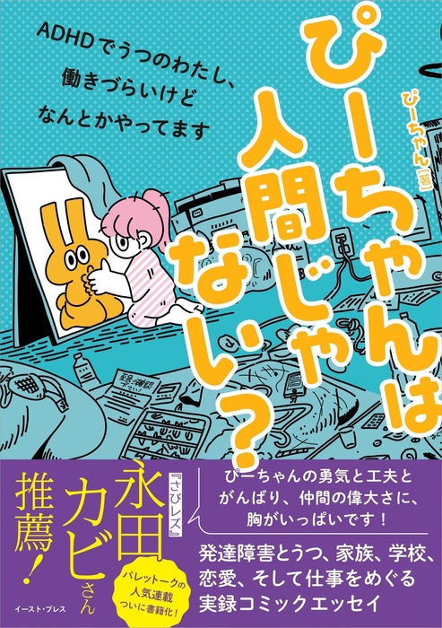 メディアプラットフォームnoteやWEBメディア「パレットーク」で連載した「ぴーちゃんは人間じゃない〜あたふた発達障害日記〜」が『ぴーちゃんは人間じゃない? ADHDでうつのわたし、働きづらいけどなんとかやってます』として、イースト・プレスから2021年1月8日(金)に発売されます。本書は連載されたコミックエッセイに、ぴーちゃんさんのコラムやお悩み相談を加えて構成されています。